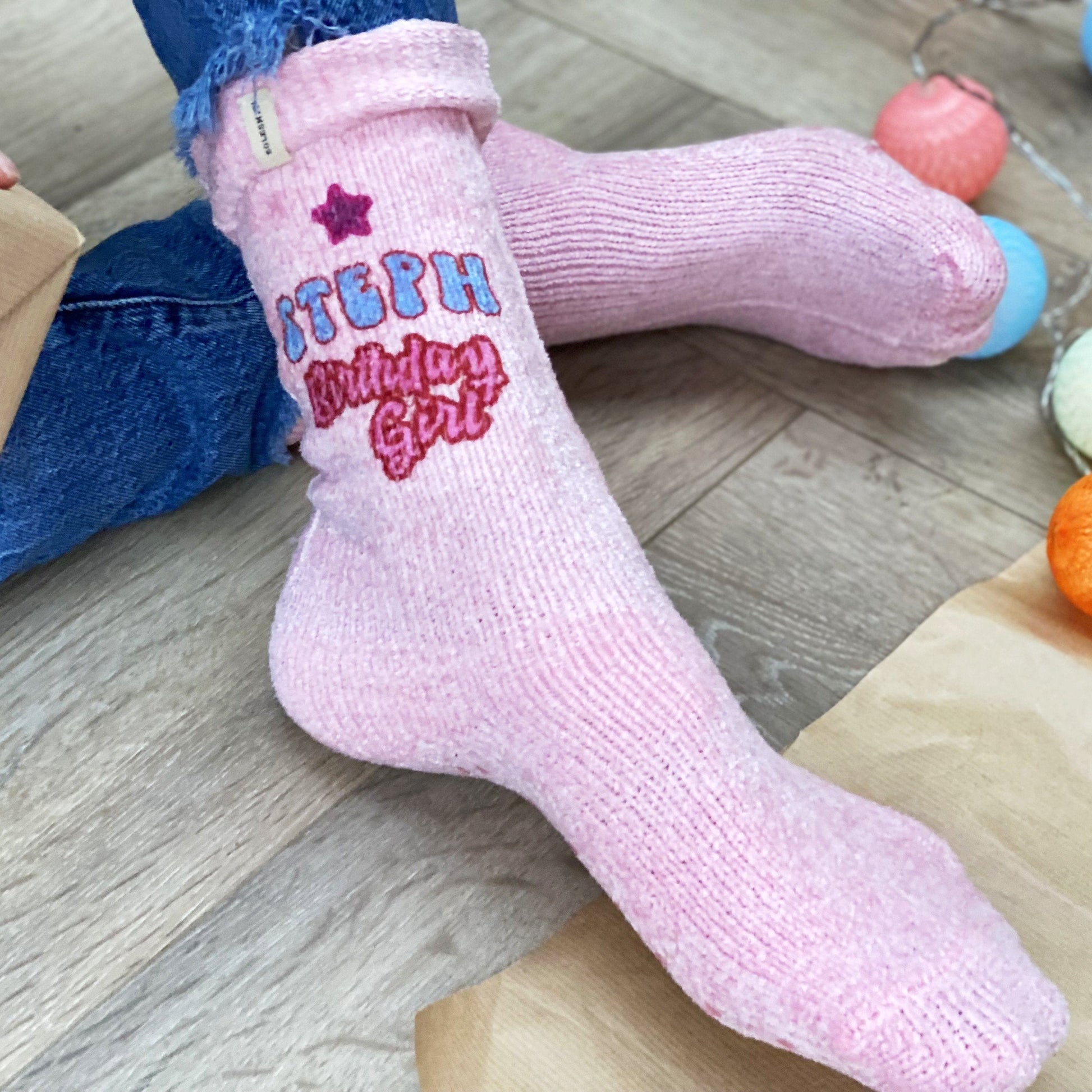 The birthday girl is here - she's in style and she is rocking gorgeous chenille pink personalised birthday socks! Woo Hoo!