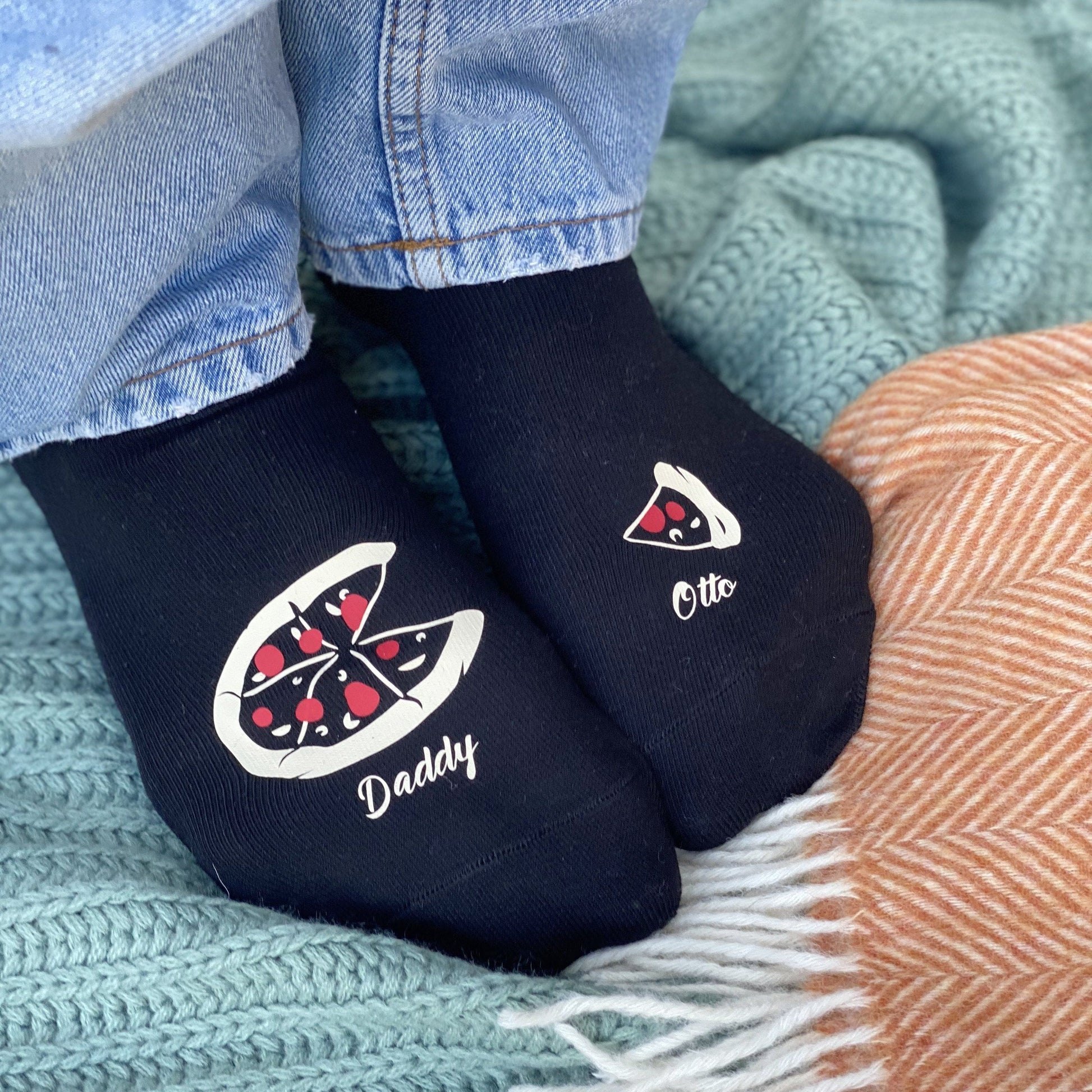 Therefore these socks are ideal for you and especially for Father's Day. The socks feature a pizza on sock one with the personalisation underneath of Daddy (dad ,Father) etc... With a slice missing which is on the other sock. Perfect for adding the child to other sock.