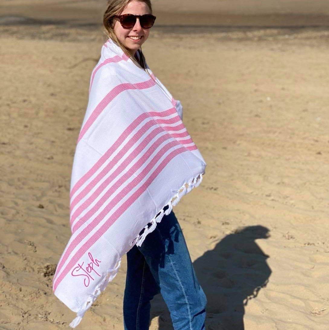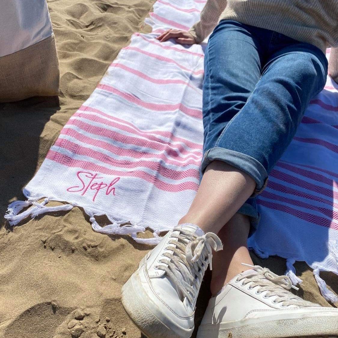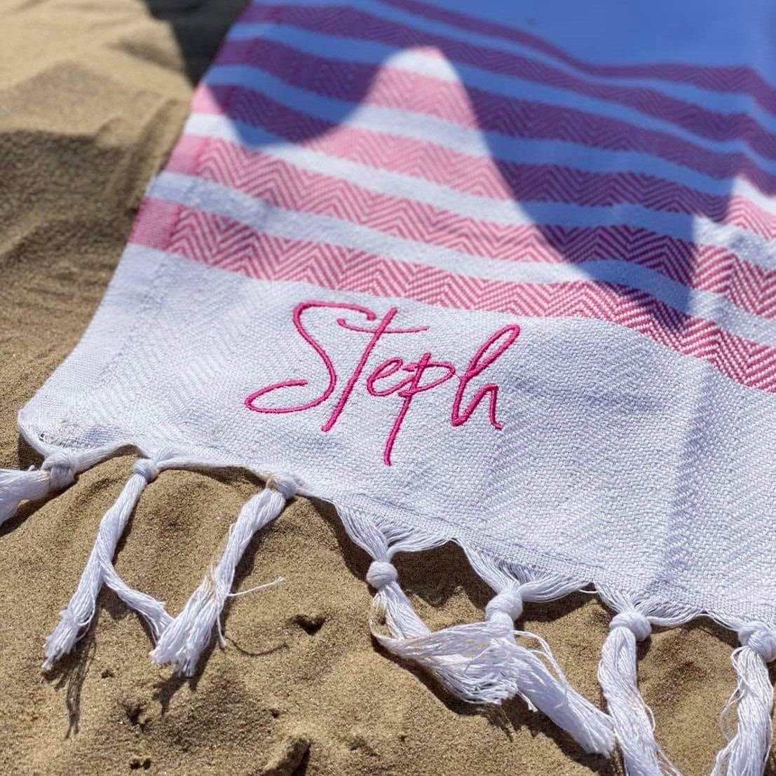 The towel comes with your name embroidered in the corner in a lovely font. The towel is 100% cotton so super soft and ideal for drying those sandy toes on the beach or drying off after a swim in the pool.