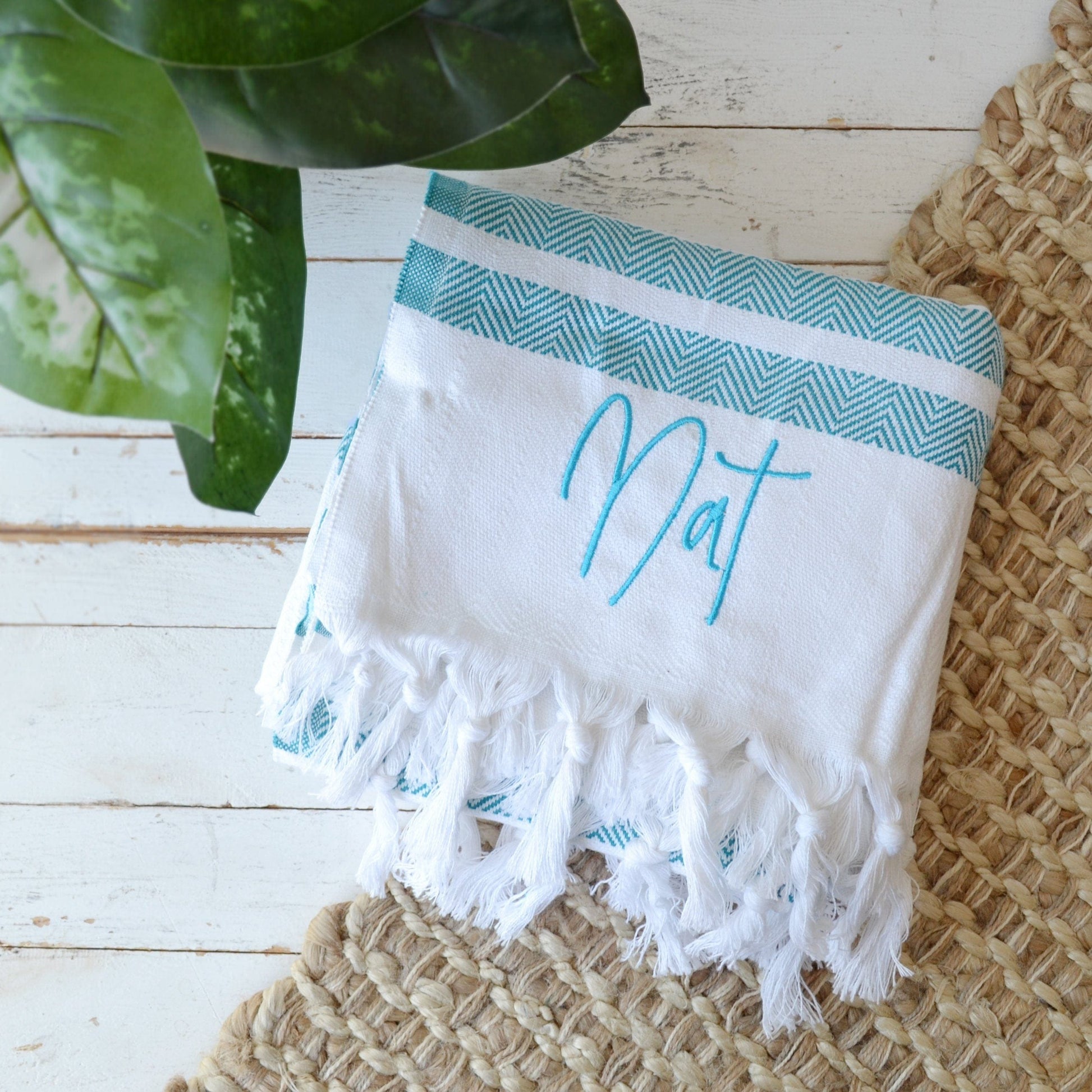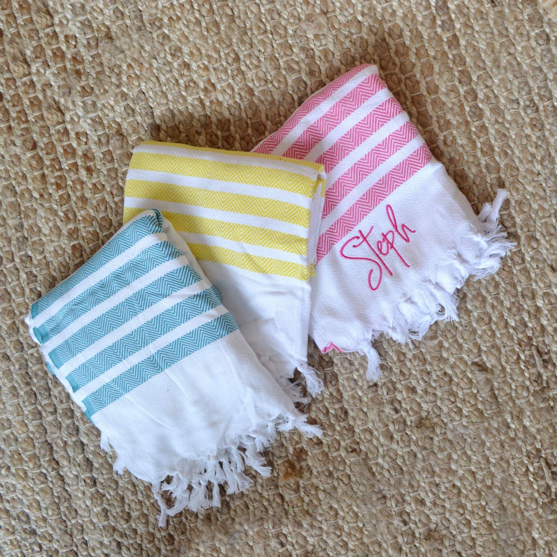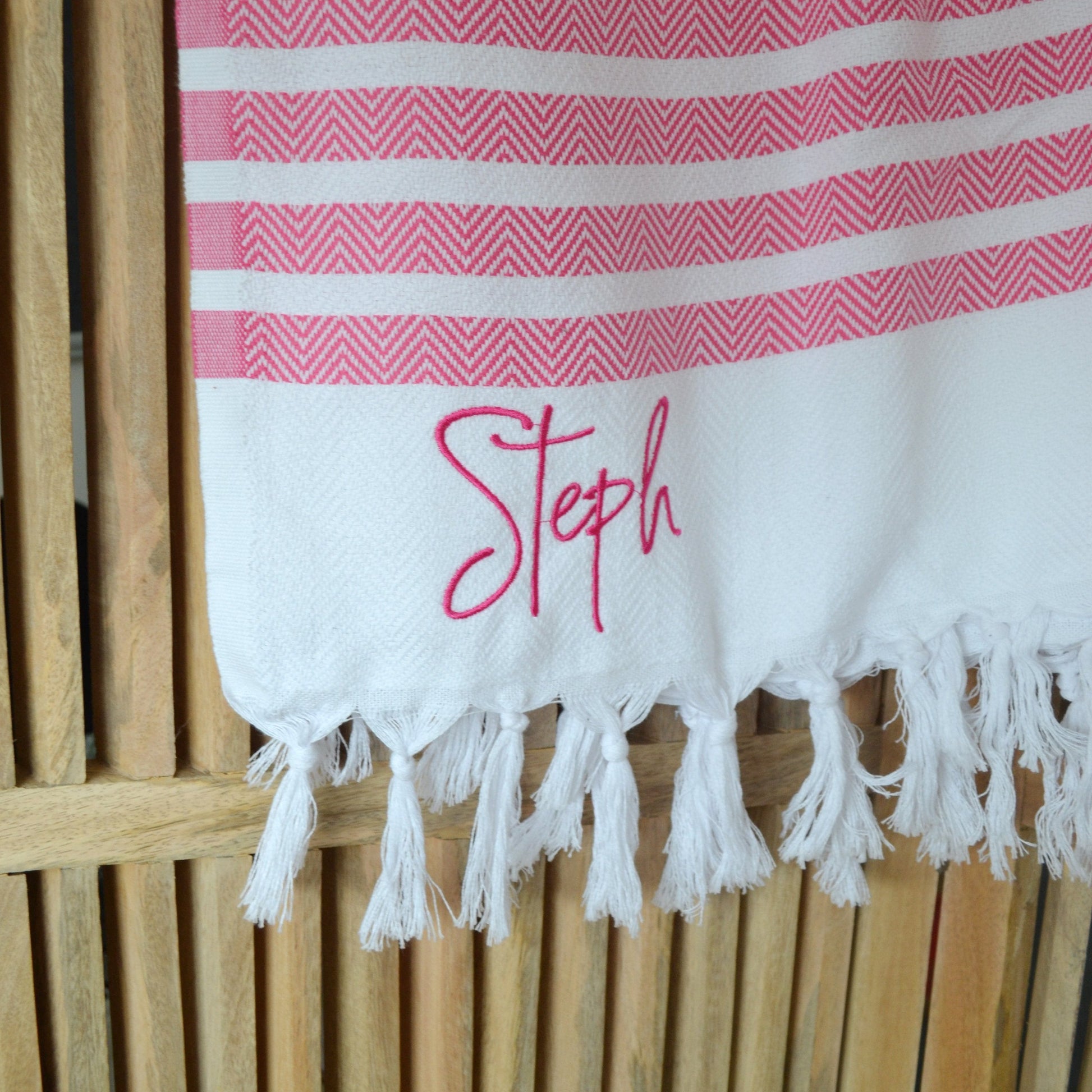 The towel comes with your name embroidered in the corner in a lovely font. The towel is 100% cotton so super soft and ideal for drying those sandy toes on the beach or drying off after a swim in the pool.