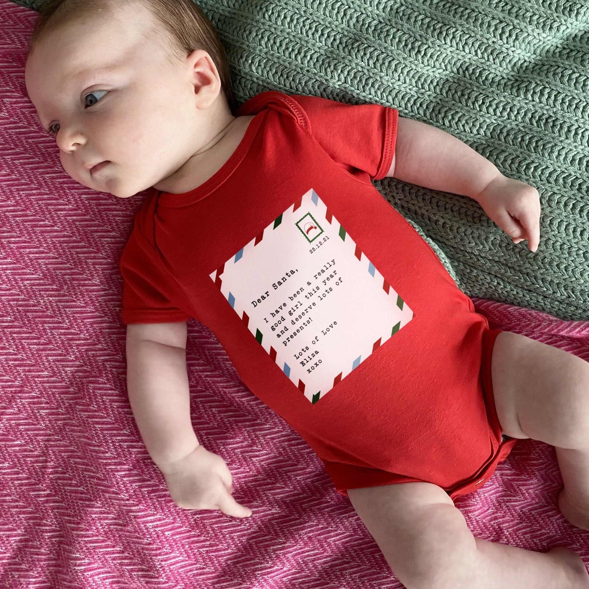 A super adorable Christmas red baby grow with a letter for Santa Claus printed on the front in bright colours and in a festive stamp style.