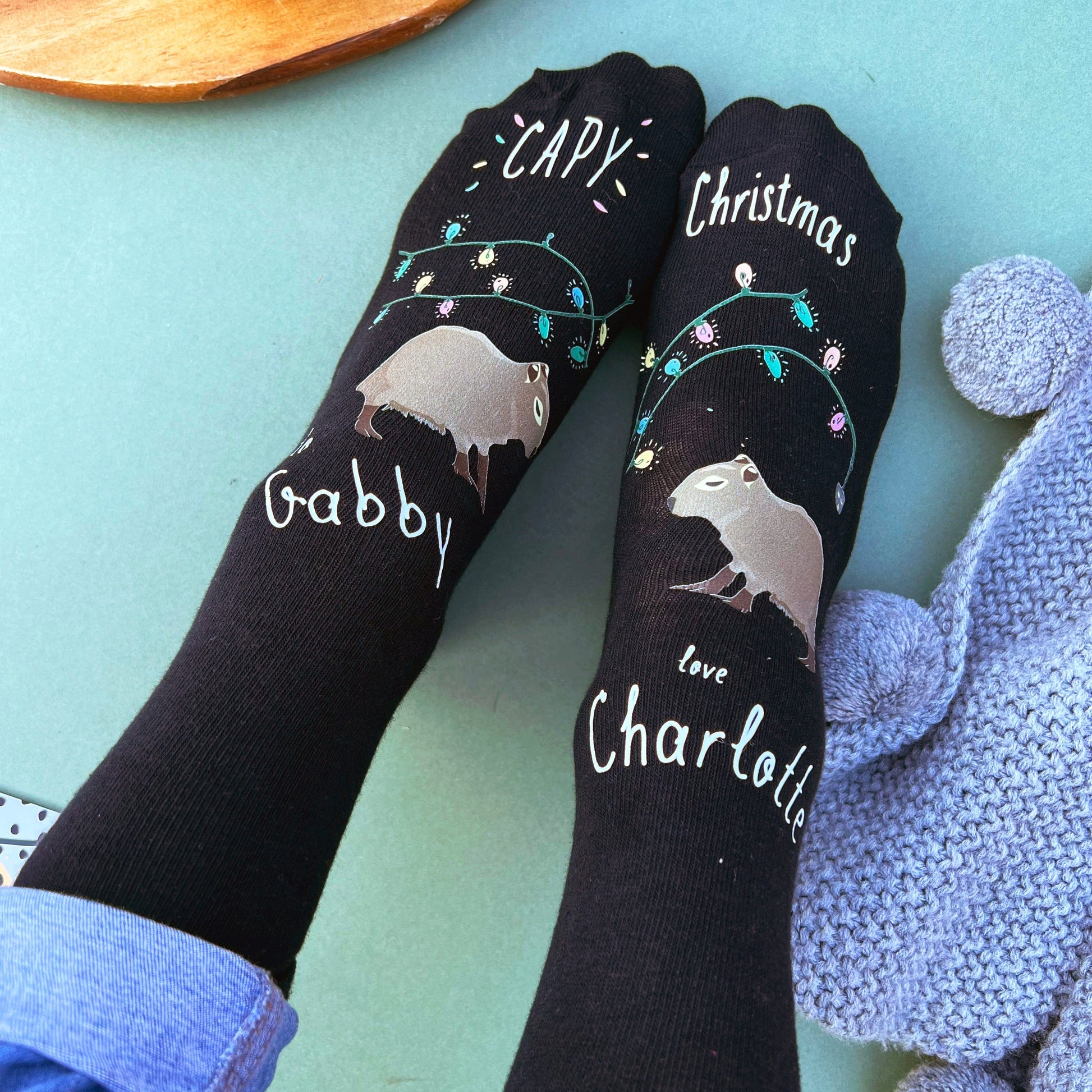 Have a Capy Christmas from a cute Capybara to you! TikTok inspired, these bright and bold christmas socks feature capybaras, festive lights and a personalised message.
