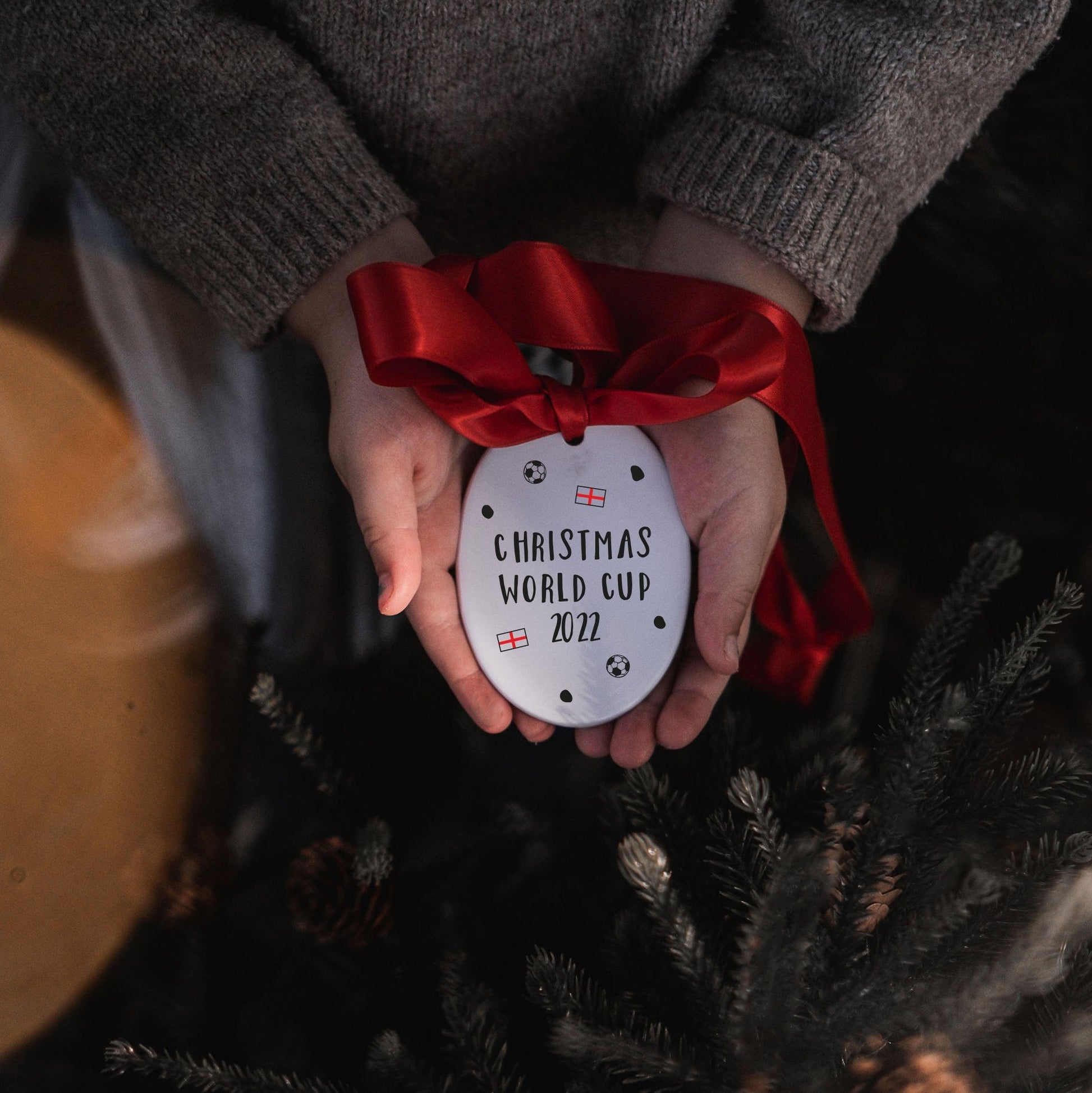 Printed onto an oval tree decoration made of ceramic and finished with a red ribbon to hang, this is the perfect Christmas decoration for a football mad household.
