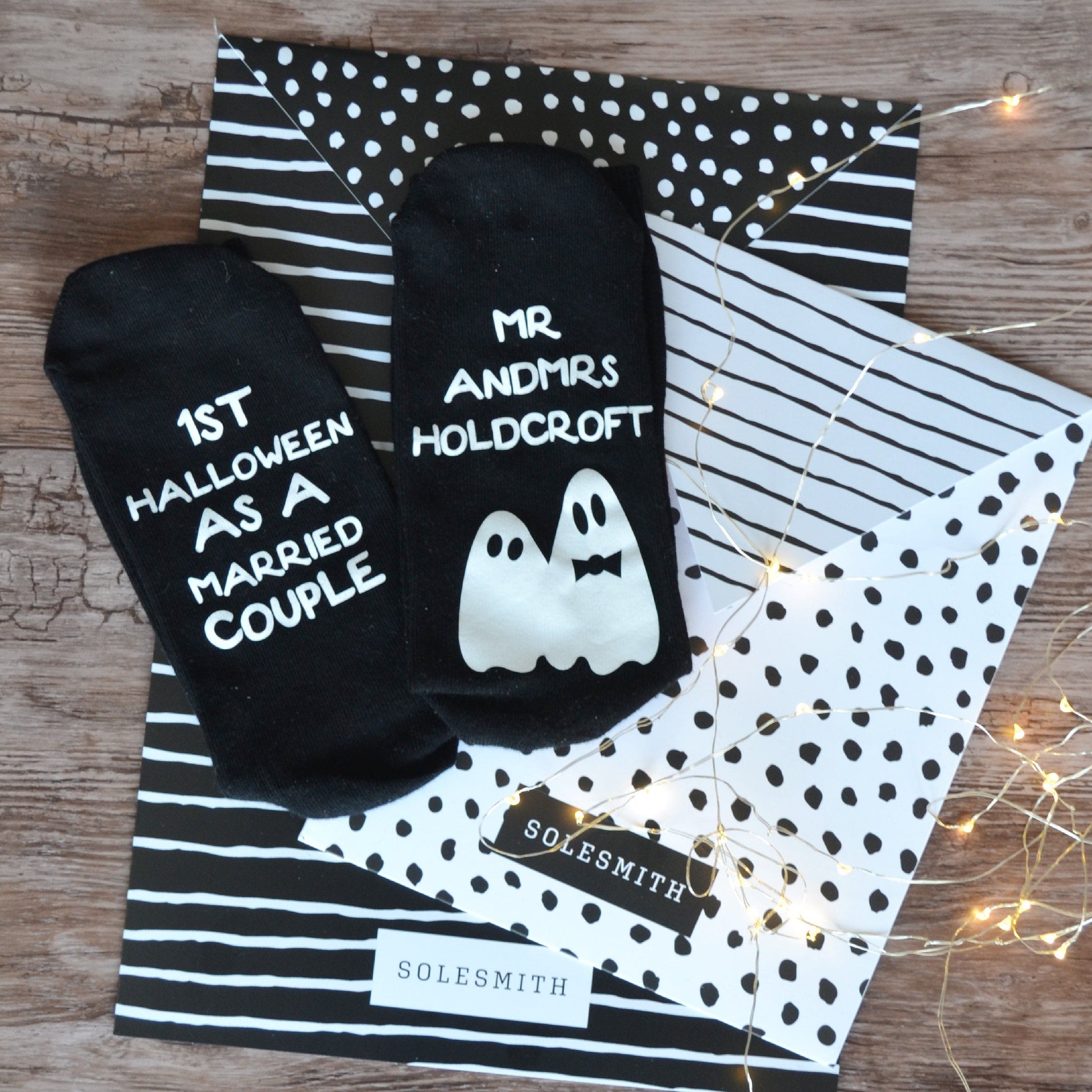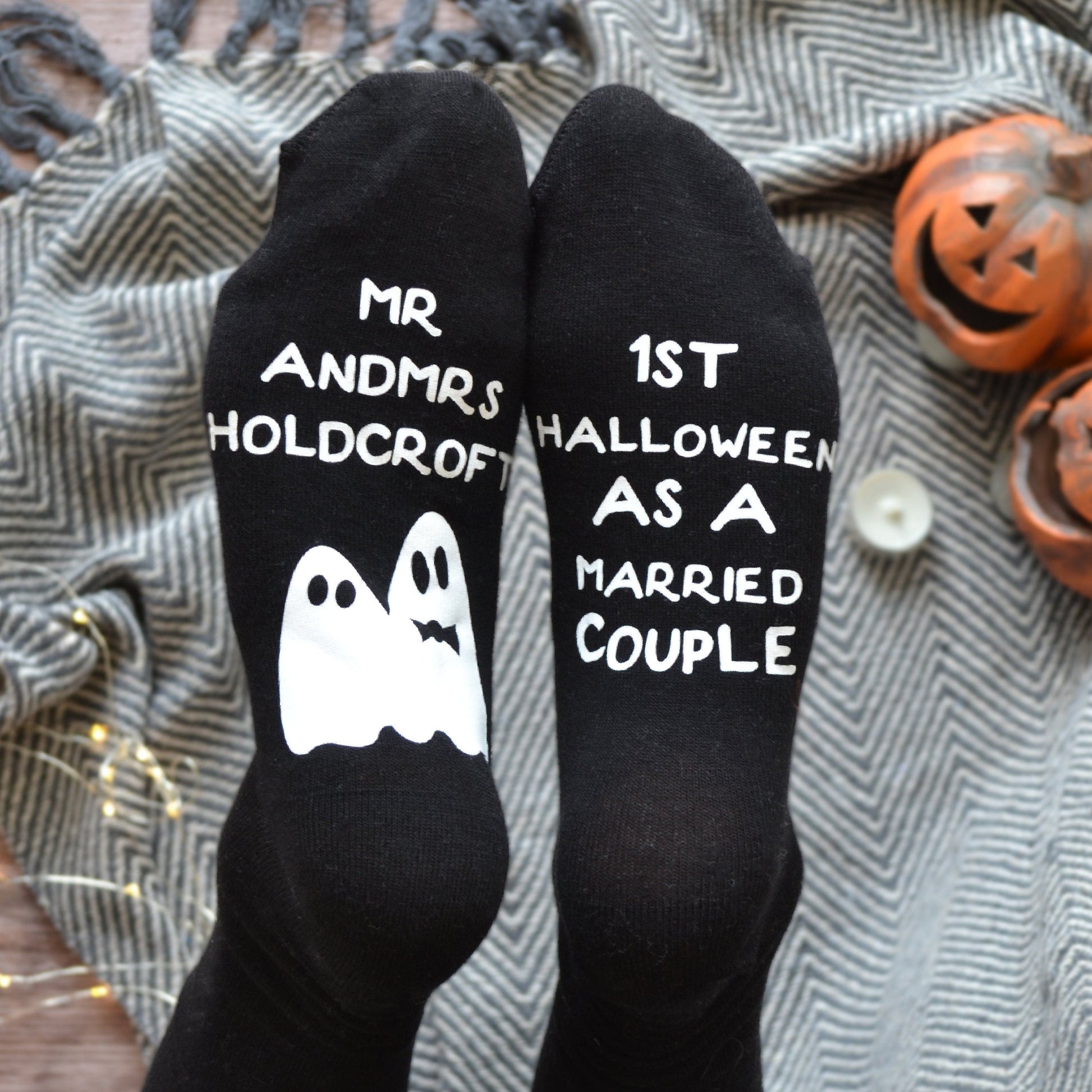 These personalised socks are printed with your name on the left sock and the choice of either two male ghosts, two female ghosts, or a male and a female ghost. Also personalise the socks with your surname. The right sock features '1st Halloween as a Married Couple'.
