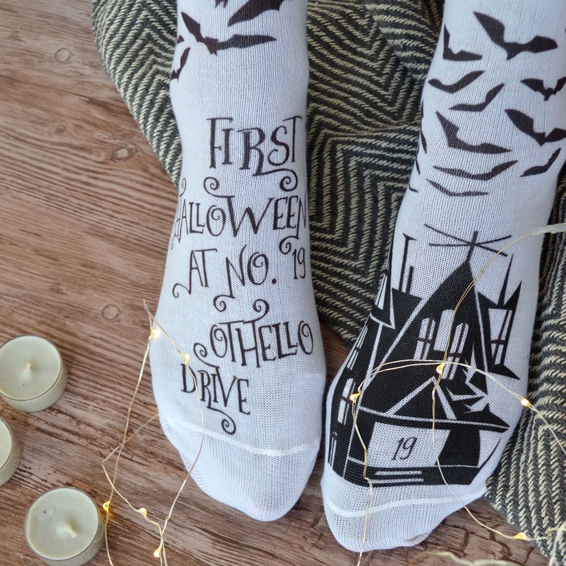 Personalise the socks with your house number and street name e.g. no.19 Othello drive, your house number will also feature on the scary house illustration to. The perfect way to remember your first Halloween in your new home together.