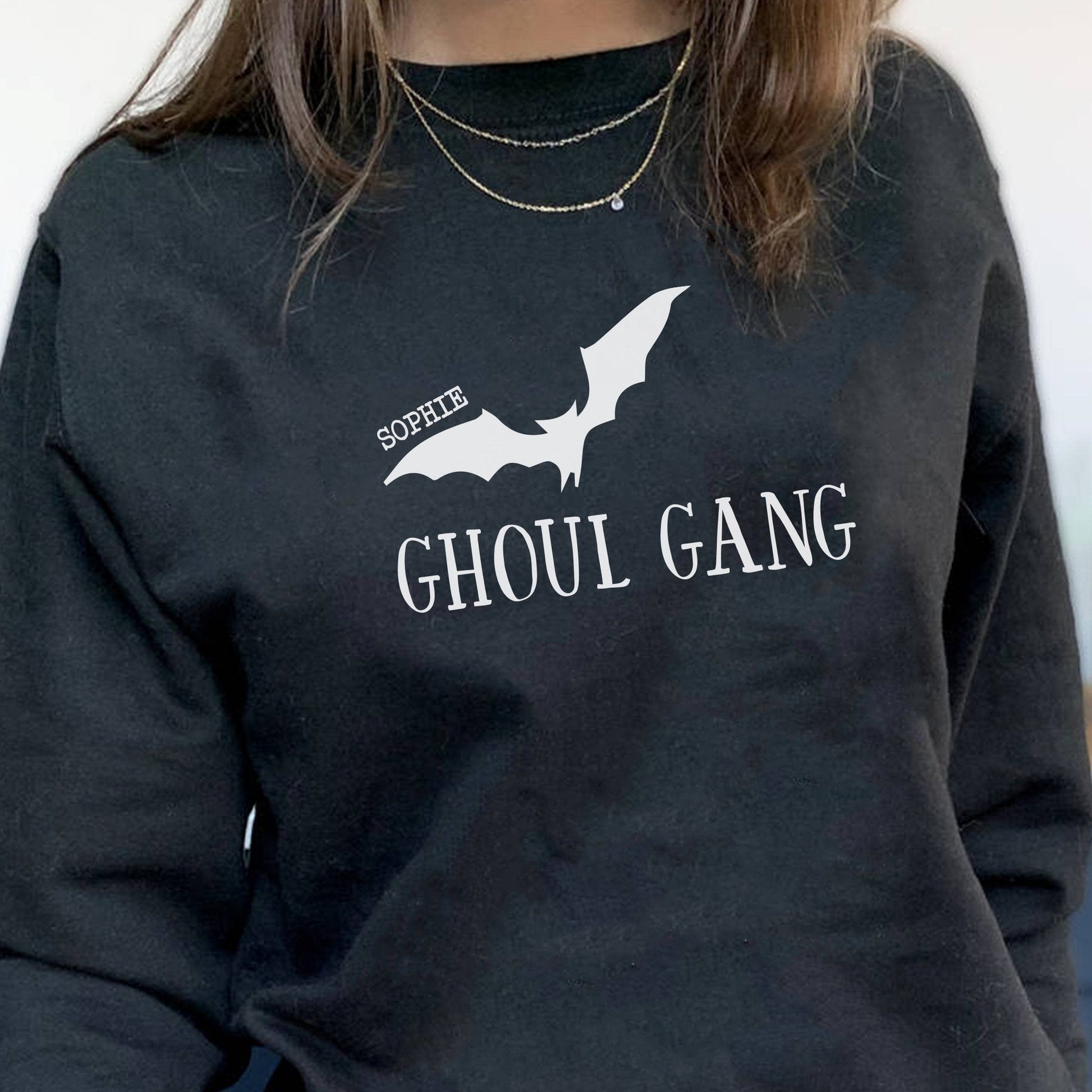The jumper features the play on girl gang with ghoul gang, personalised with your name above the bat, it is the jumper that will make the entire outfit! Wear together personalised with your own names to the Halloween party.
