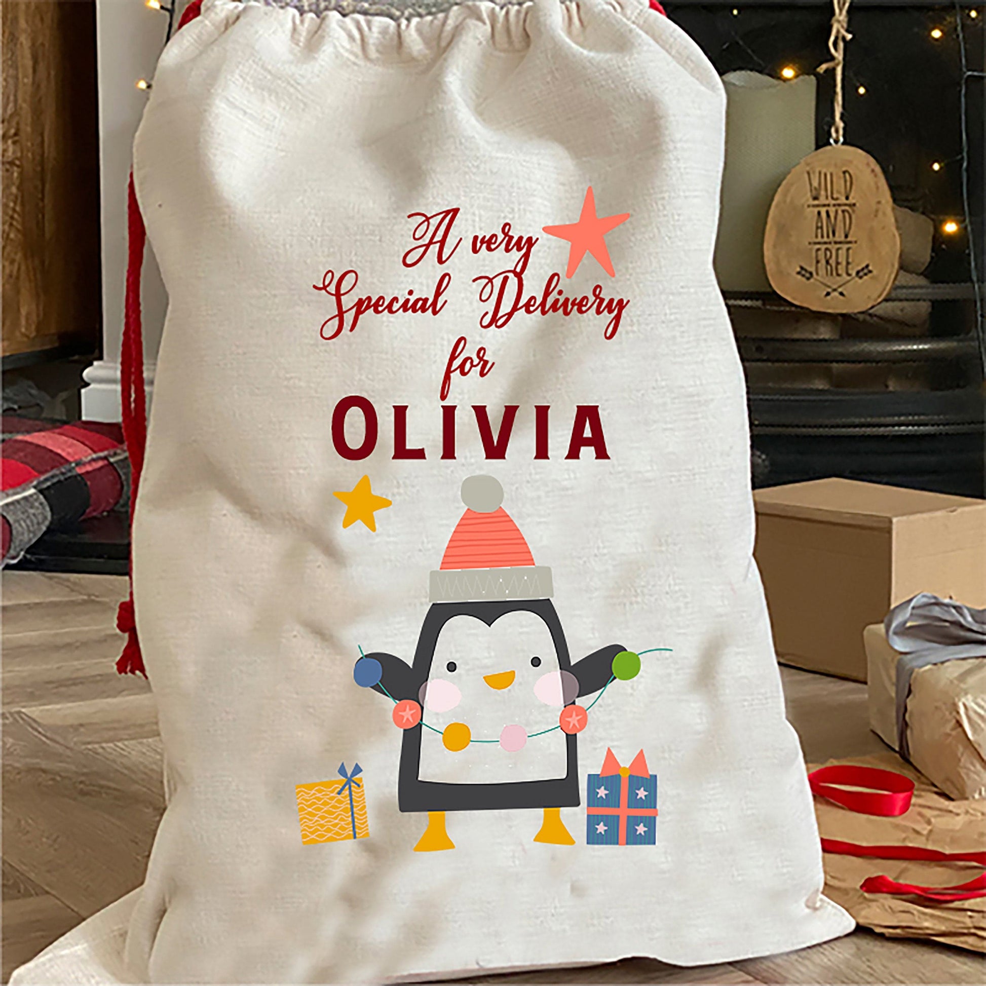 This is the cutest Christmas sack around, complete with an adorable penguin and personalised with a name - all made to order in our Derbyshire studio.