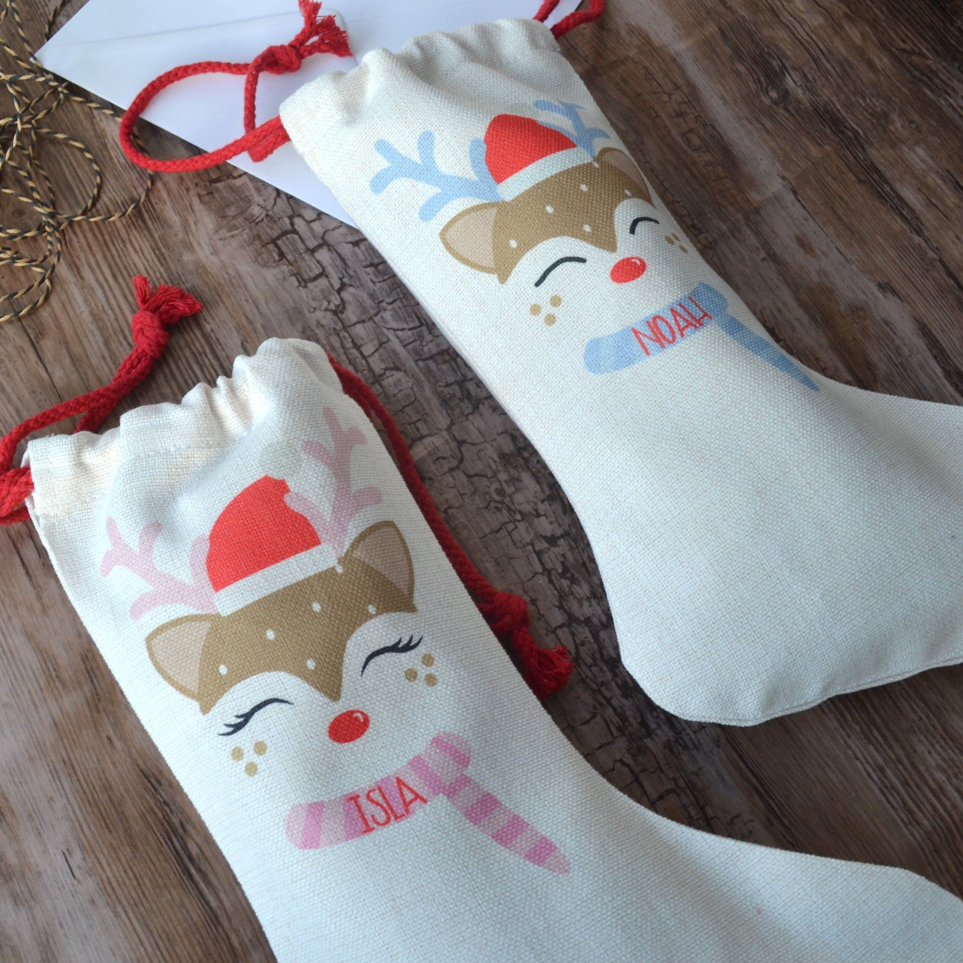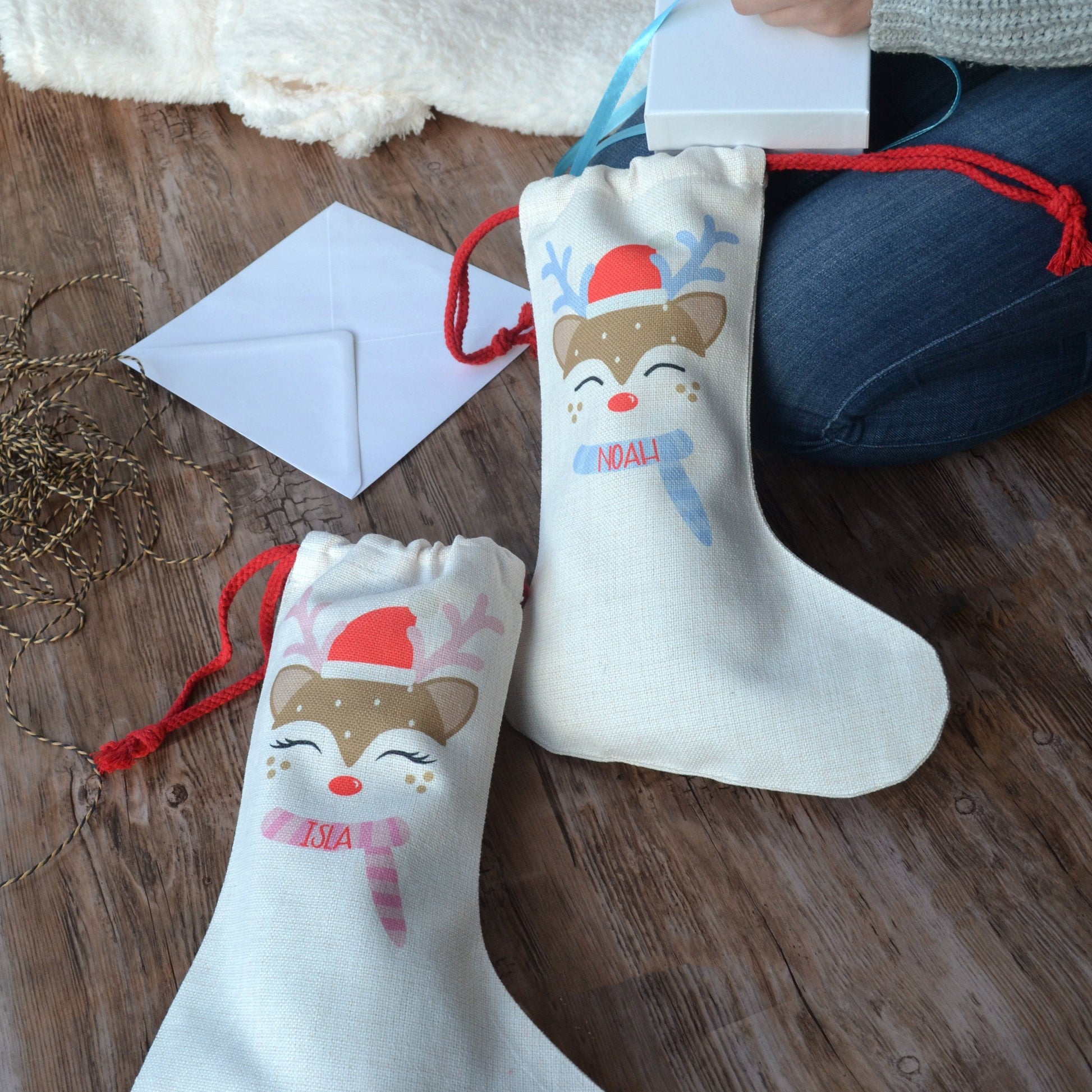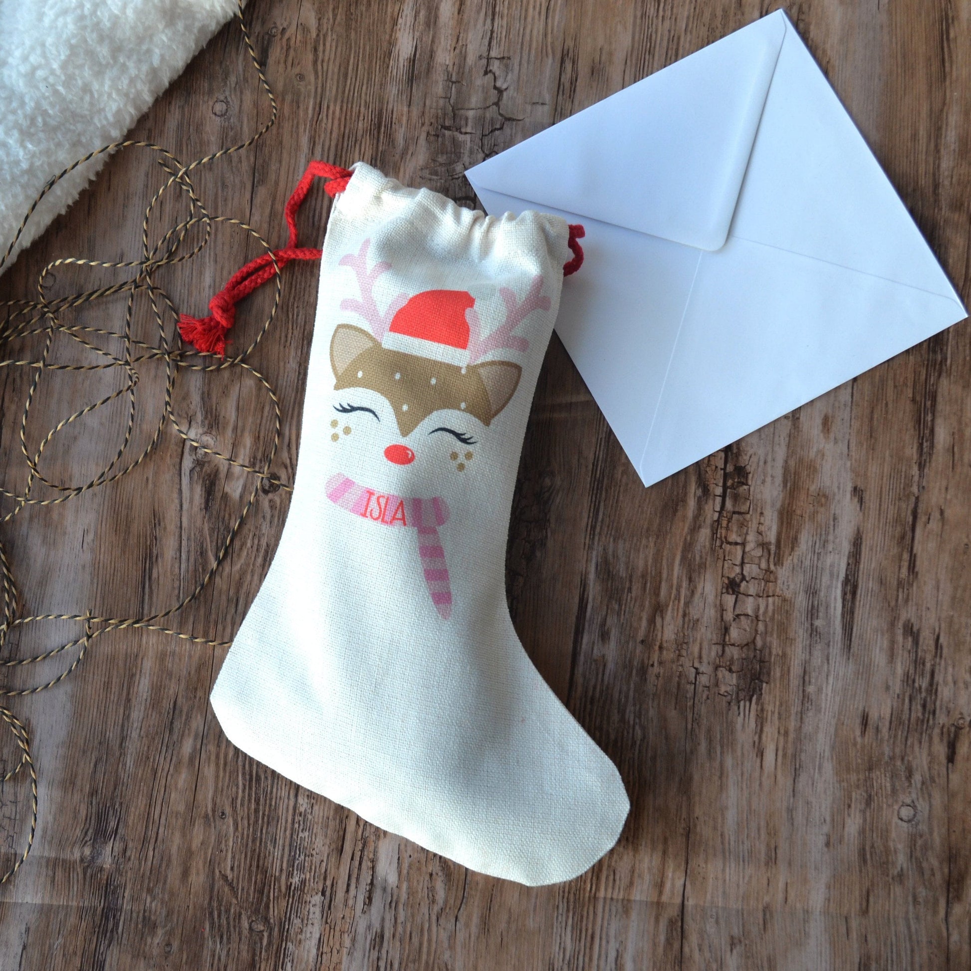 A personalised stocking with an adorable reindeer design. These stockings are perfect for treating your favourite little one on Christmas morning! Their faces will light up when they see their reindeer stocking full of gifts. The stocking will look great hung up on a mantlepiece or at the end of the bed.