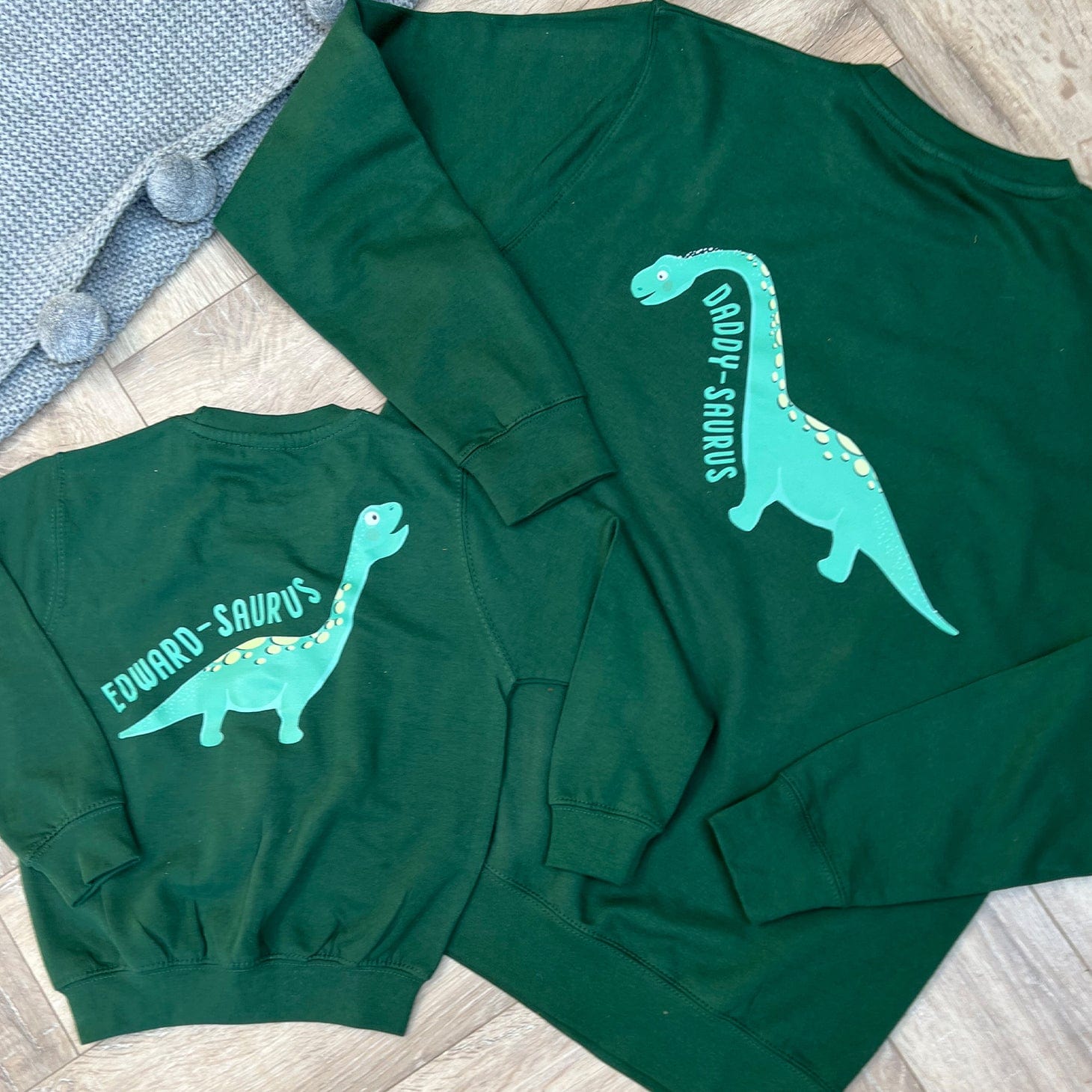 Twinning parent and me jumpers, perfect for those dino tracking adventures. Personalised on the back for the perfect gift.