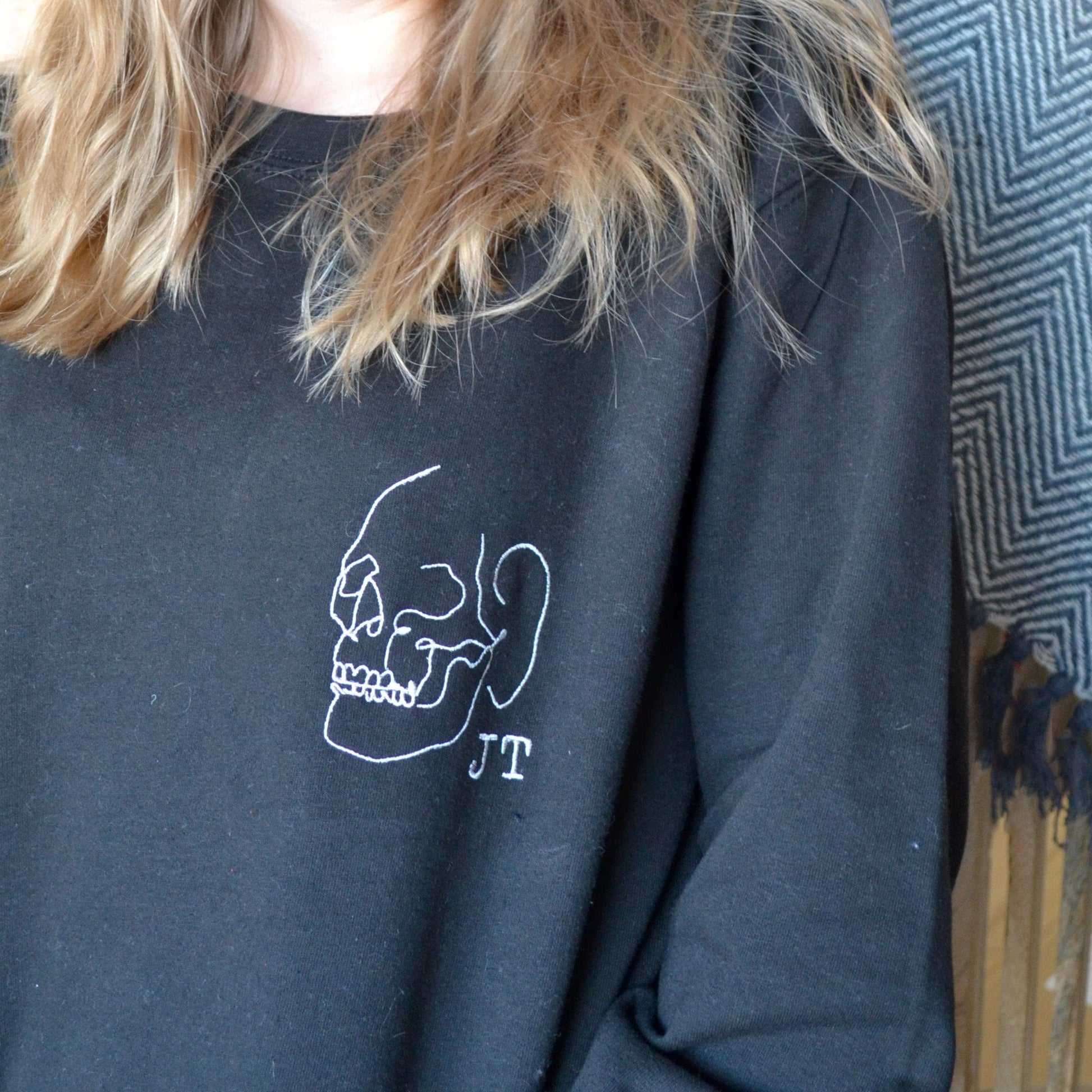 The jumper is black making the white embroidered skull stand out and become the focal point of the personalised jumper.