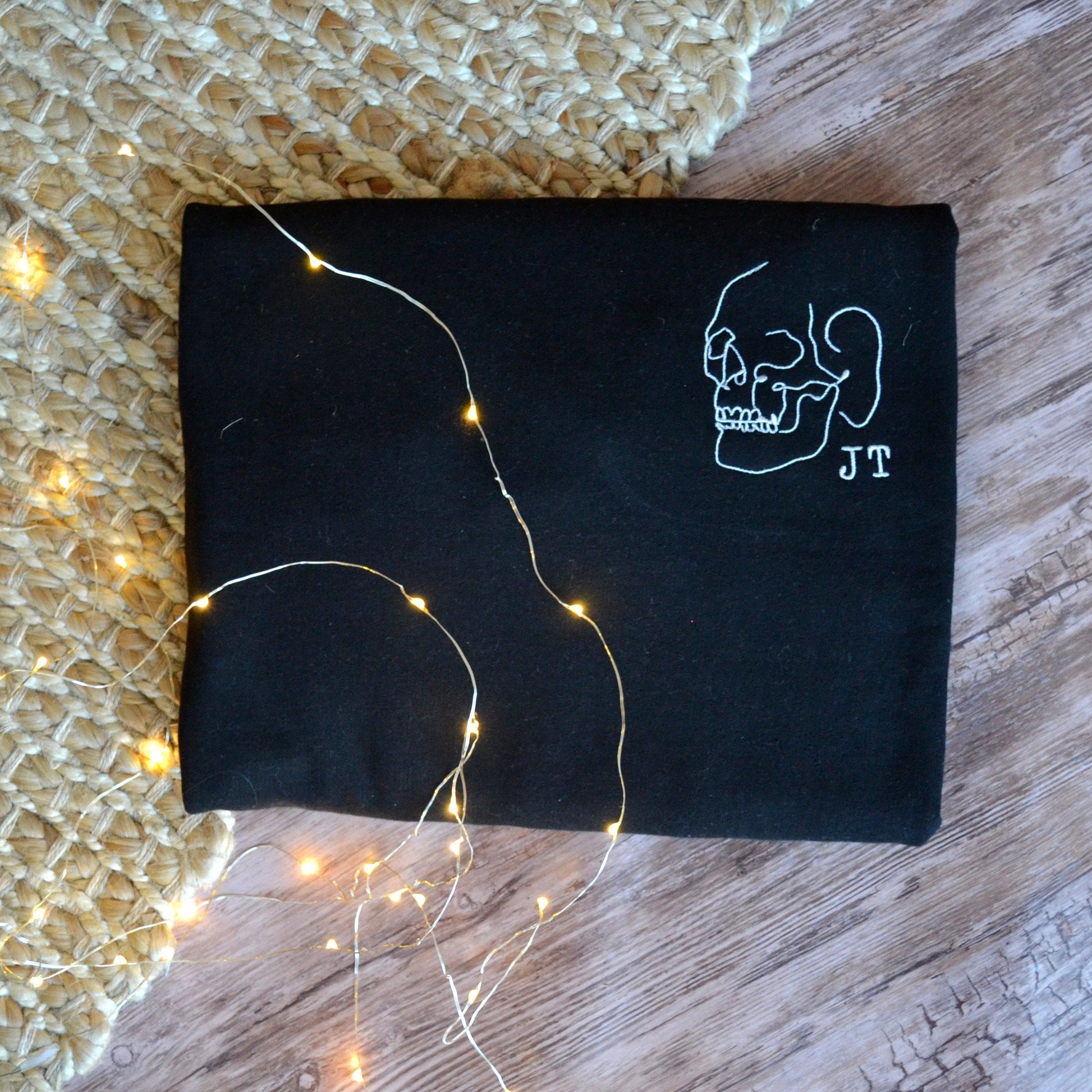 The jumper has the amazing embroidered skull illustration on the front along with your initials personalised underneath. A fabulous classy personalised Halloween jumper/sweatshirt.