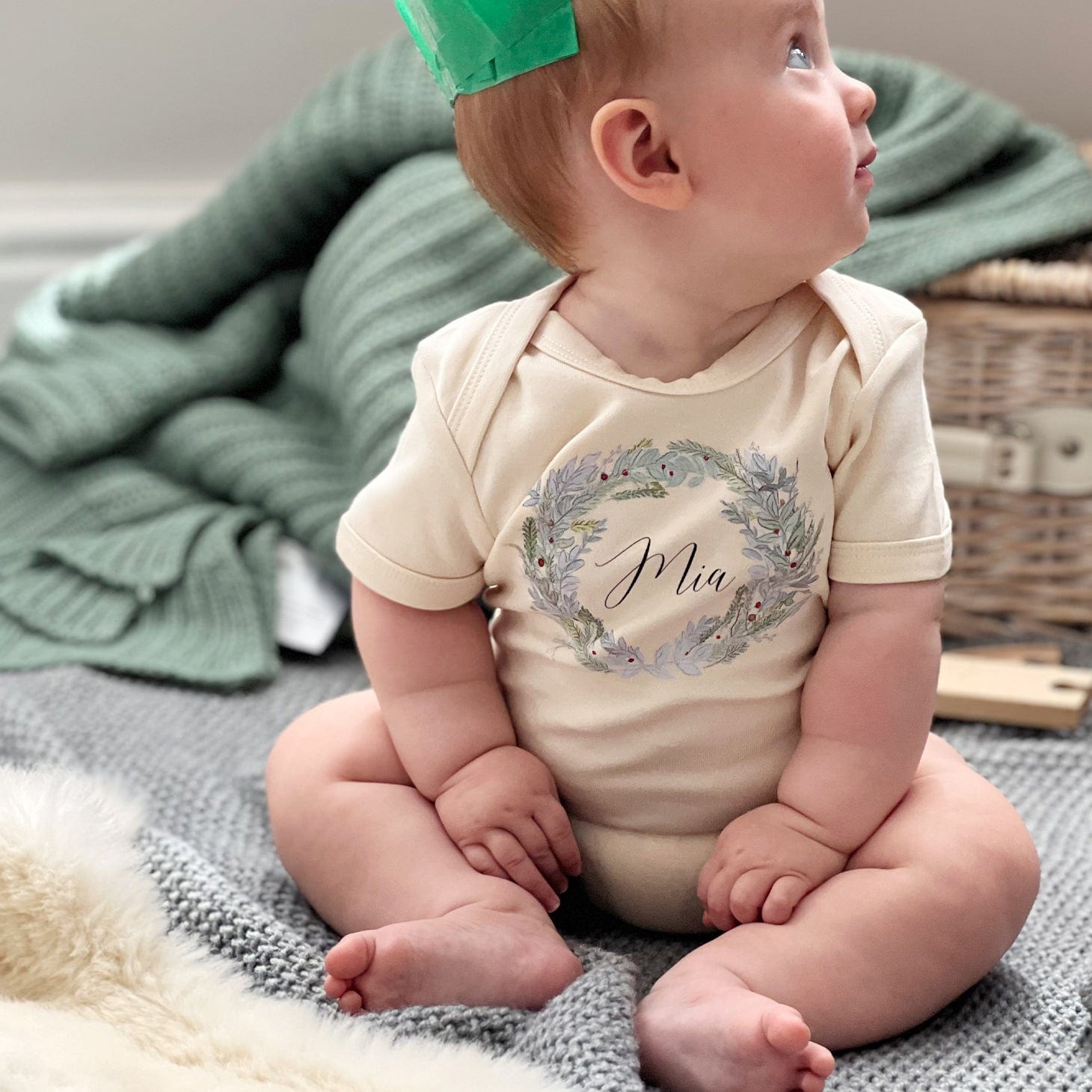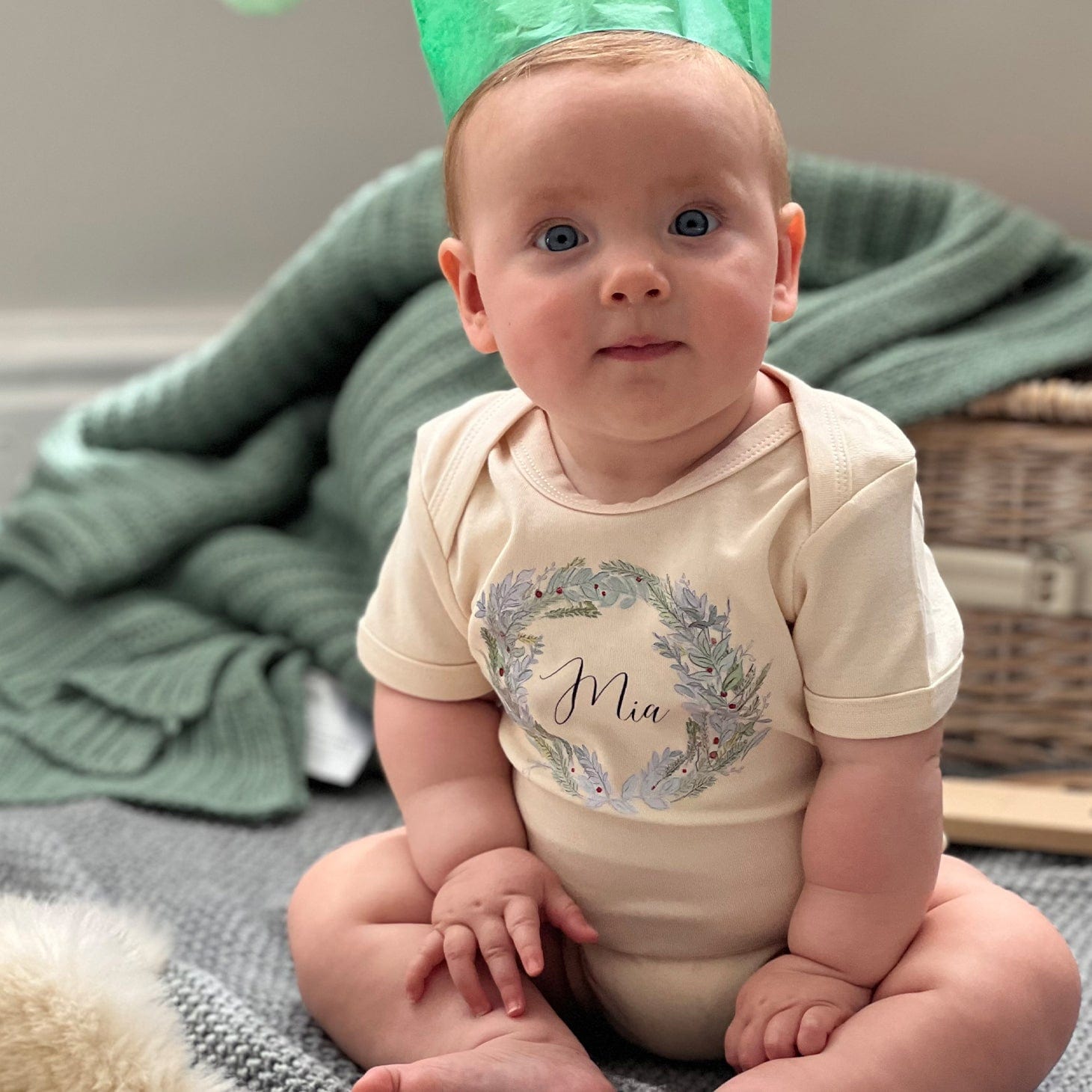 This adorable festive baby grow is the perfect Christmas gift for a baby, with a beautiful hand drawn wreath design.