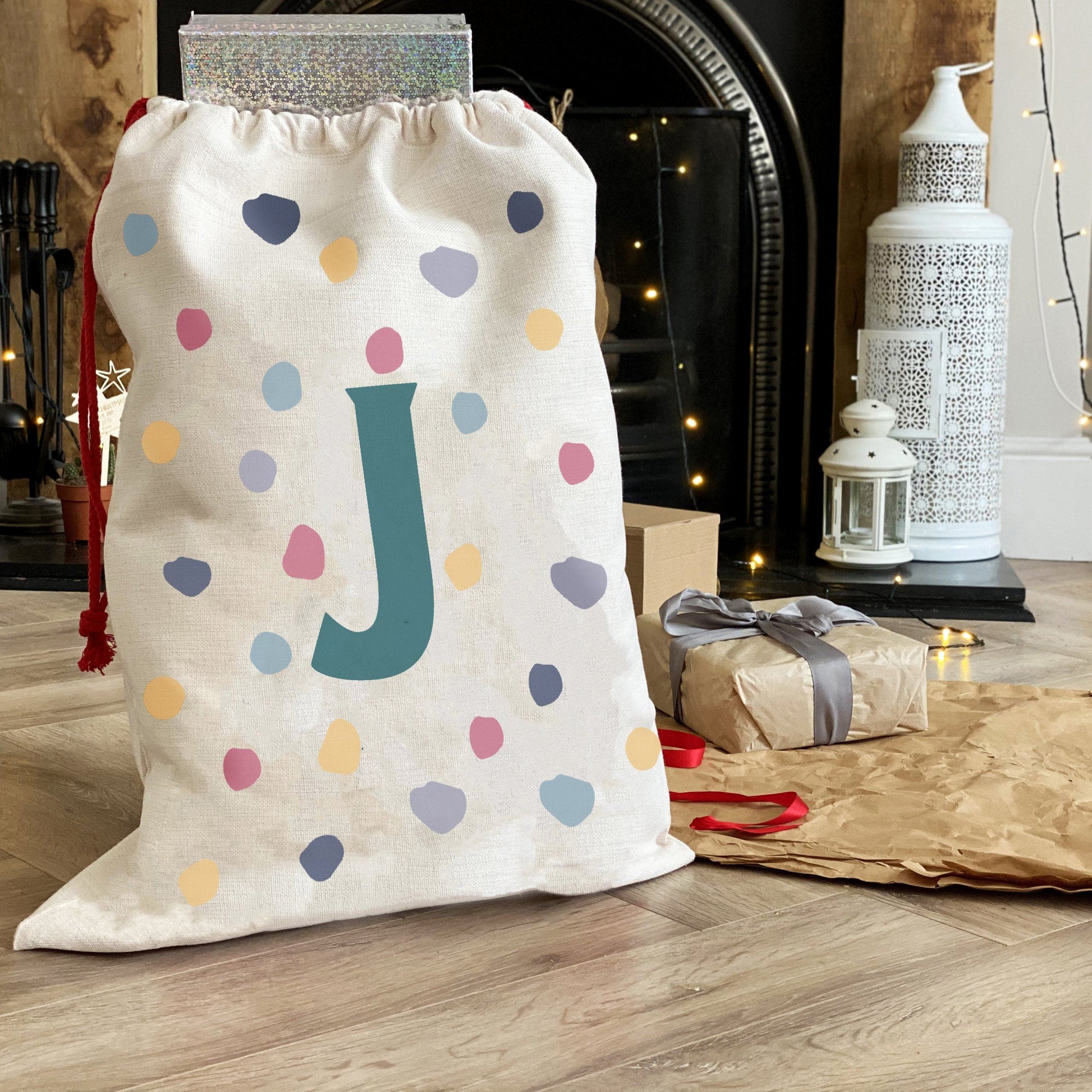A super contemporary personalised Christmas sack printed with pastel spots all over the front along with your initial in bold.